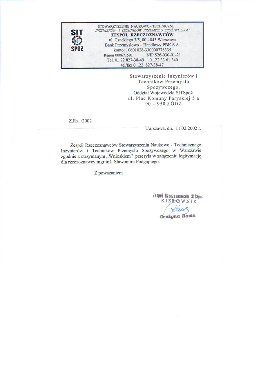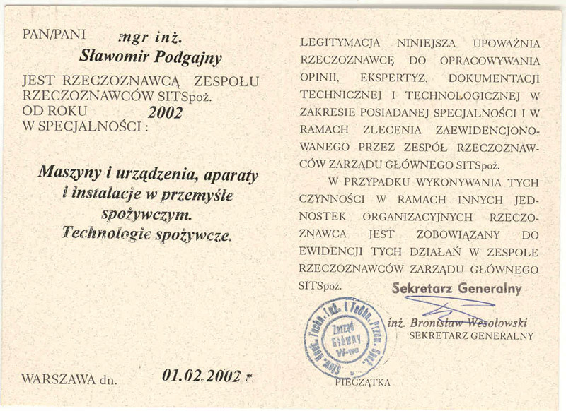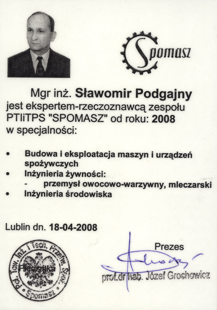 Ekspert - Rzeczoznawca zespołu PTIiTPS SPOMASZ