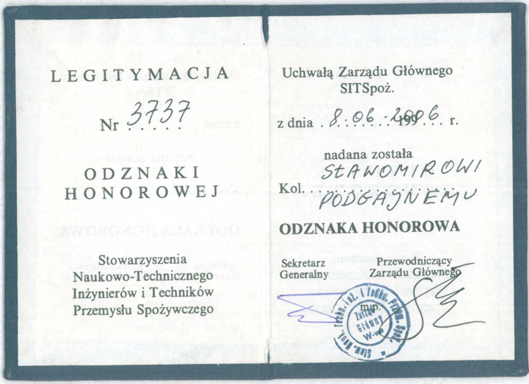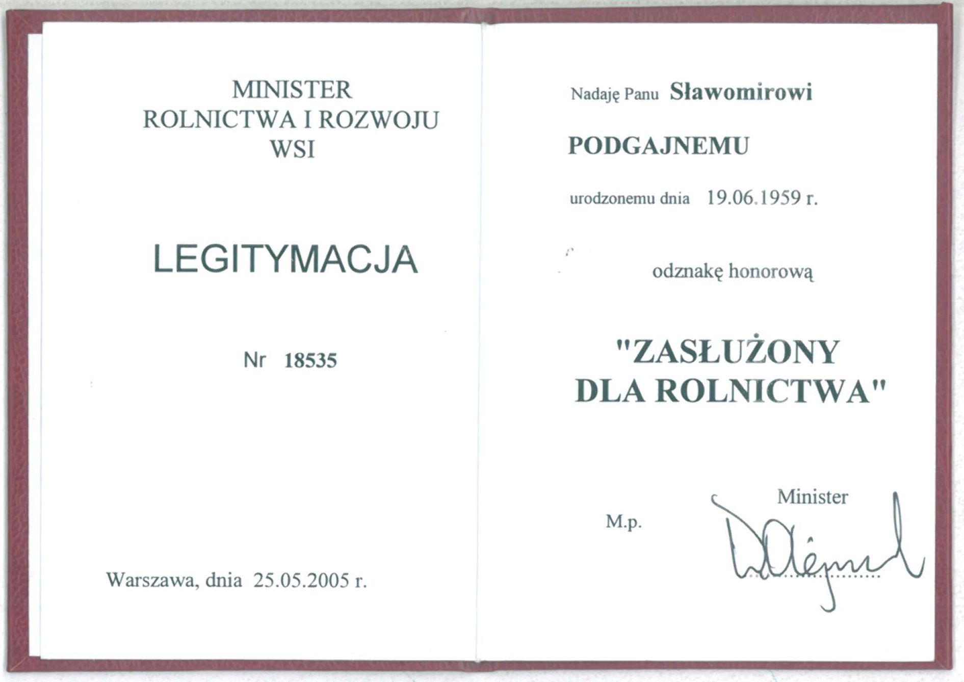 legitymacja Zasłużony dla rolnictwa